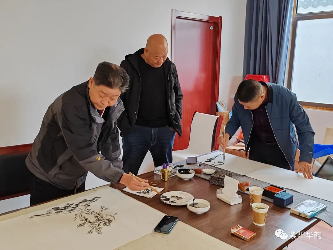 庐江县志愿者协会主席沈小林、会员李红广和陶老九亲临东郡温泉山庄文旅室现场书法作画