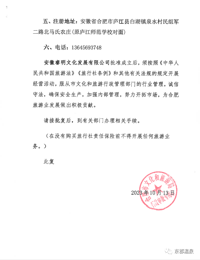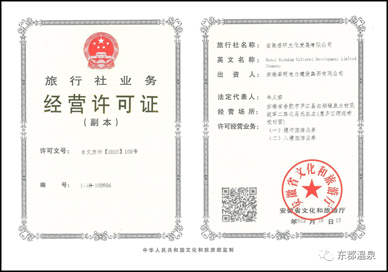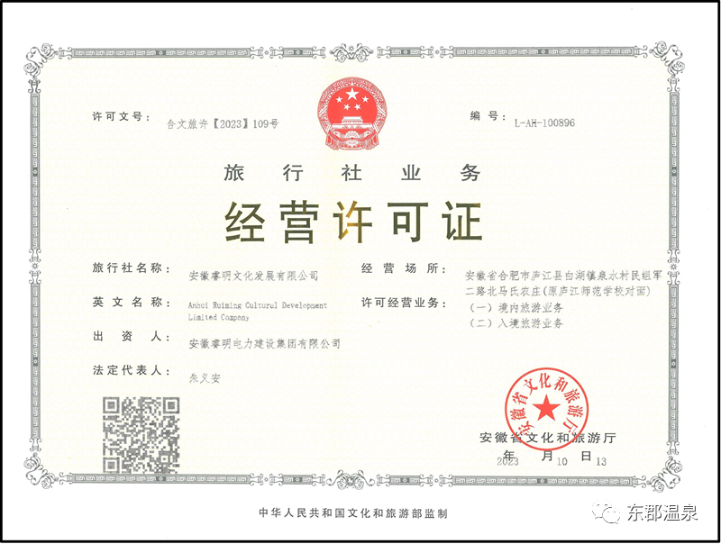 2023年8月,安徽睿明文化发展公司与东郡温泉山庄重组成立一家新型旅游企业——安徽睿明旅行社有限公司,并于2023年10月获得国内入境旅游业务资质,全额缴纳质保金30万元,注册资金1000万元。