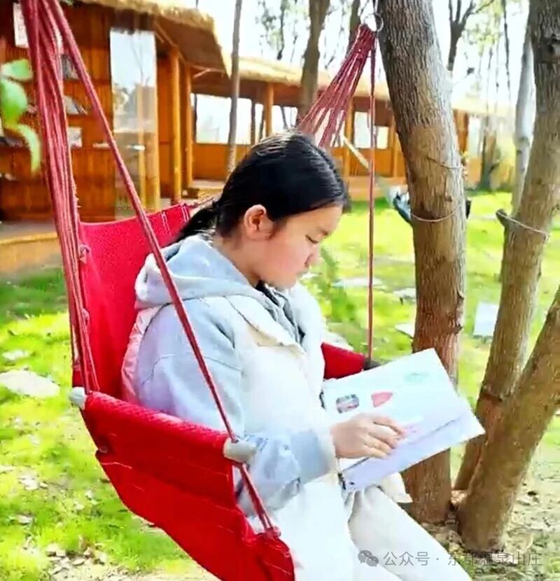 丛林里的百味书房,是大人和孩子们闹中取静的精神角落。每到周末,都有家长带着孩子来到小小书屋,原木的书架上,近千册课外书籍可以任意选读。柔和的光线射进书屋格外温暖,窗外绿意鸟鸣相伴,捧书静坐小课桌前或躺在吊床上,让心灵在书香与自然中得到滋养沉淀。